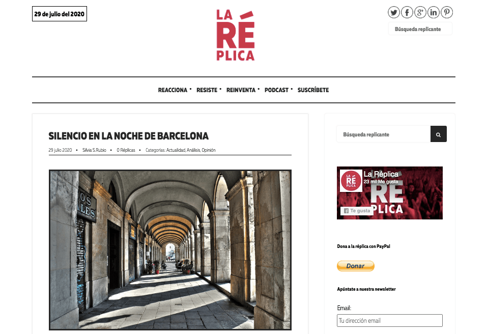 ARTÍCULOS https://lareplica.es/silencio-noche-de-barcelona/ https://lareplica.es/la-pandemia-a-traves-de-la-boqueria/ http://thecitizen.es/actualidad/the-black-wall-movement https://lareplica.es/author/silvia-rubio/ http://thecitizen.es/actualidad/orgullo-loco-una-llamada-de-atencion-al-sistema https://www.lamonomagazine.com/collage-literario-una-historia-a-5-bandas-junio/ http://thecitizen.es/actualidad/marihuana-el-momento-es-ahora http://thecitizen.es/actualidad/una-nueva-realidad-mas-literaria http://thecitizen.es/literatura/el-caballero-del-covid19 https://www.lamonomagazine.com/featured-in-lamononewspaper-street-art-reset-las-calles-se-reinventan/# https://www.lamonomagazine.com/streetstories-historias-para-leer-en-10-minutos/ Comparte esto: Haz clic para compartir en X (Se abre en una ventana nueva) X Haz clic para compartir en Facebook (Se abre en una ventana nueva) Facebook Haz clic para enviar un enlace por correo electrónico a un amigo (Se abre en una ventana nueva) Correo electrónico Haz clic para compartir en WhatsApp (Se abre en una ventana nueva) WhatsApp Haz clic para compartir en LinkedIn (Se abre en una ventana nueva) LinkedIn Me gusta Cargando...